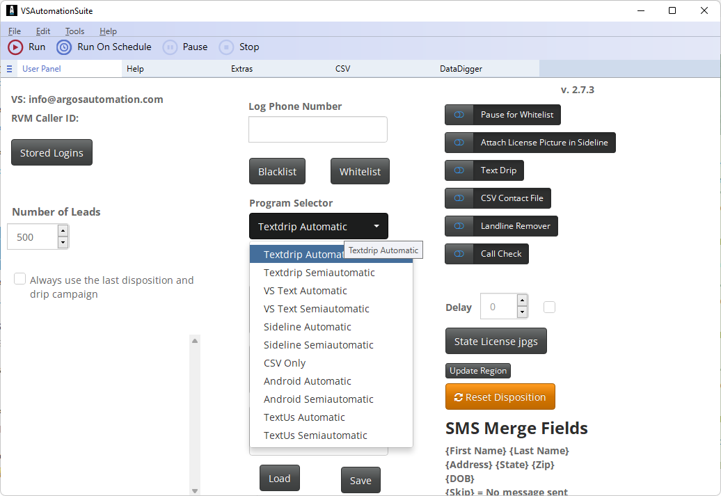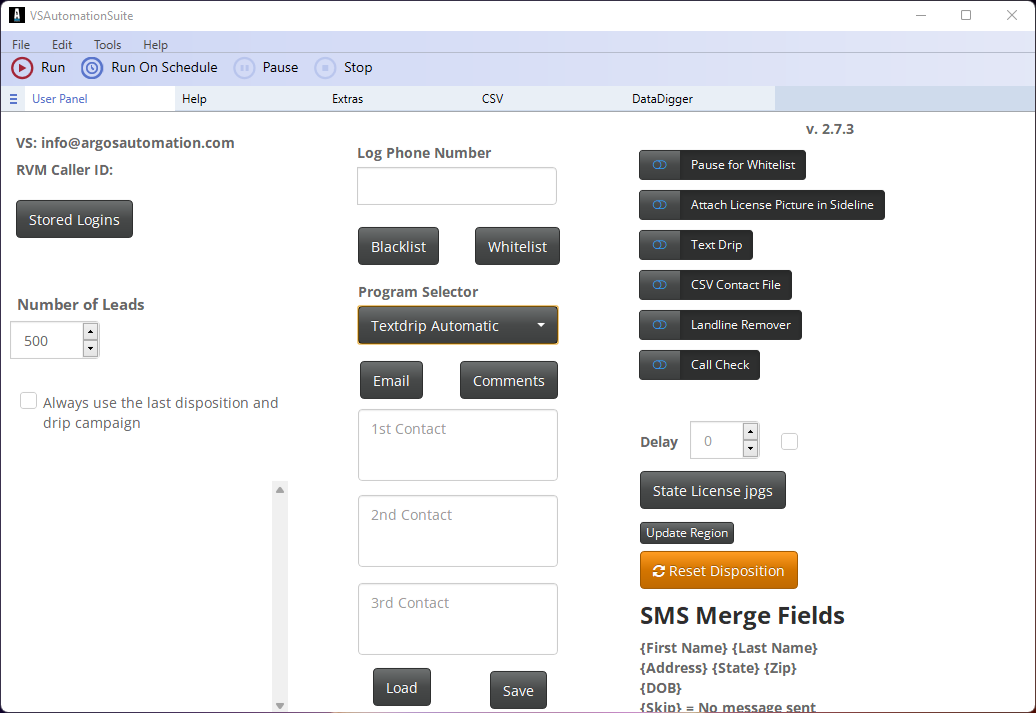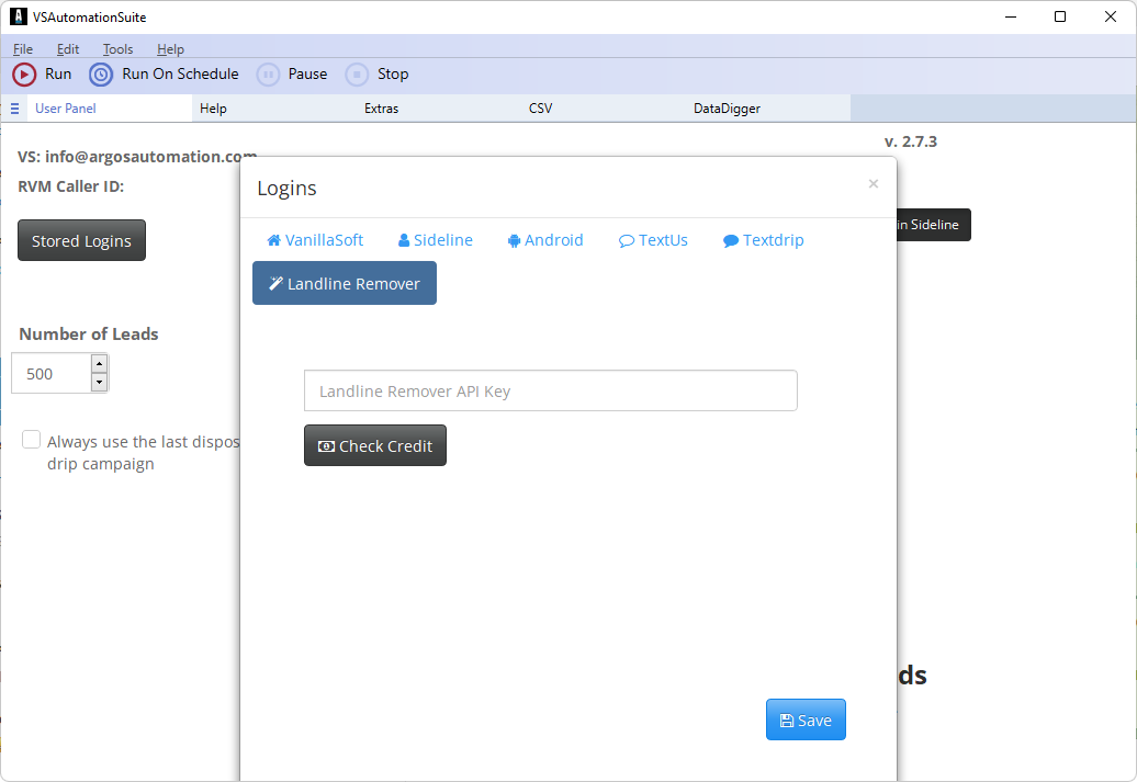 7. Enter your credentials for VanillaSoft and the program you use for texting. Click the Save button once you have entered the login credentials for any programs you will be using. Click Run to start the program. The first time you run the program there will be a 2 minute wait where it seems like it isn’t doing anything. You will then be presented with a list of dispositions from VanillaSoft. Pick the disposition for No Contact as your default disposition.